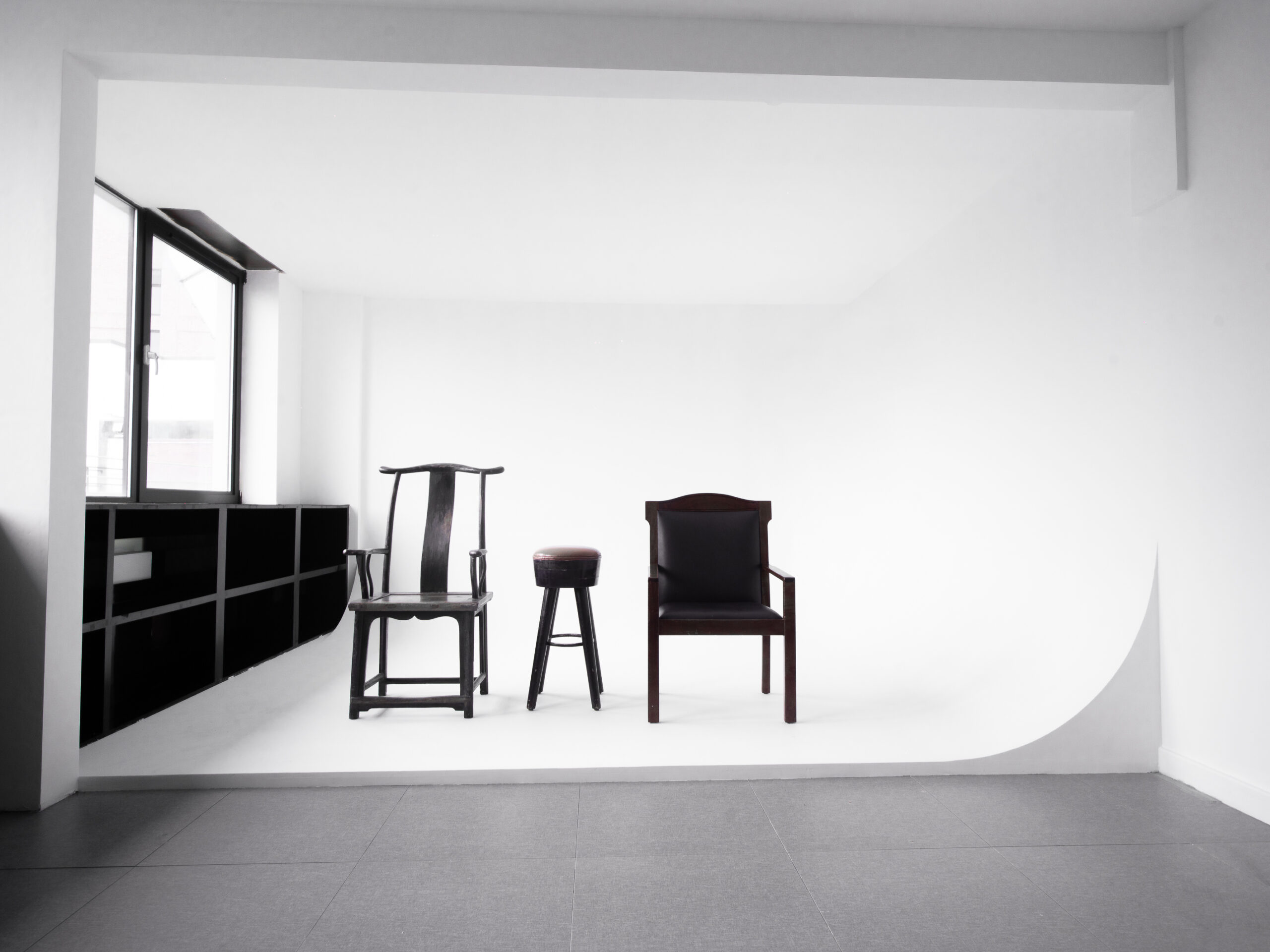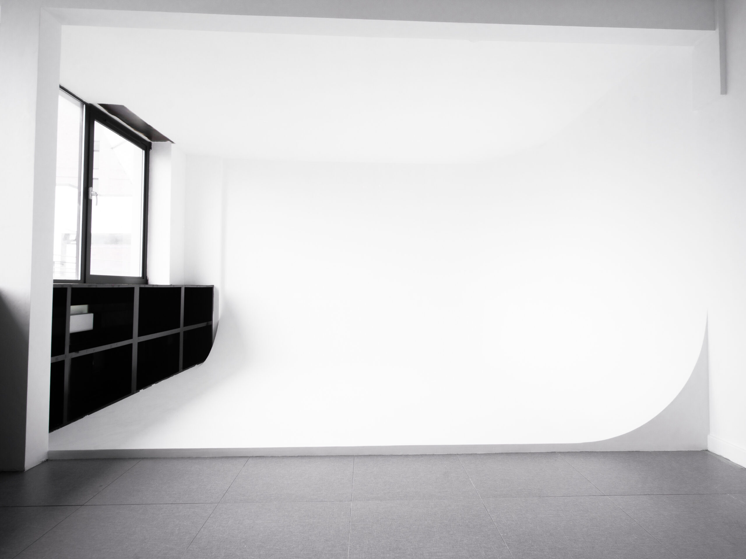 Bright cyclorama studio with soft natural daylight.